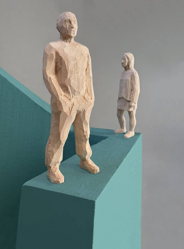 The two human figures are part of a larger sculptural installation (see the series Trimmed Off). In this work, their environment is altered and extended digitally to include a geometric composition that brings new context to the group. Observed from above, the figures now double as diagram points.