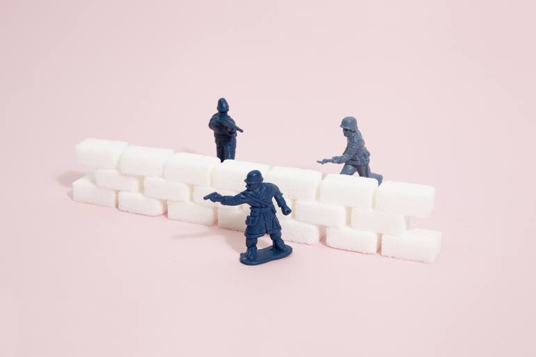 Battlefield with plastic soldiers separated by a wall border of white sugar cubes. Minimal color still life photography. • • • Original printed with 10mm margin Print certification available