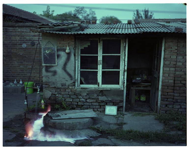 Photography, high definition print on photographic paper. The artist lit a fire on part of a street breaking the serenity with this ethereal event. The streetscape drifts between unreality and reality.