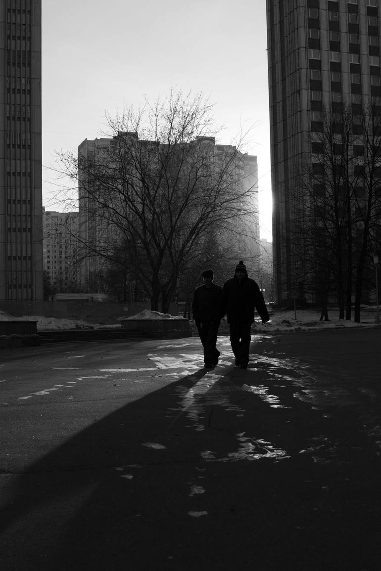 In a cold, quiet street flanked by tall buildings, two men walk into the fading light, their shadows stretching long before them. The symmetry of architecture meets the warmth of human connection. This piece explores presence, memory, and movement through stillness.