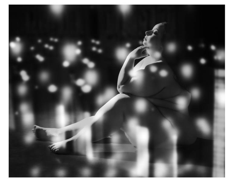 Description: "Twinkle Twinkle" is an evocative and surreal photographic composite that masterfully blends the human form with elements of light and architecture. This artwork layers three images: the serene profile of a nude, plus-sized woman seated with her head tilted upward in a tranquil pose; s...