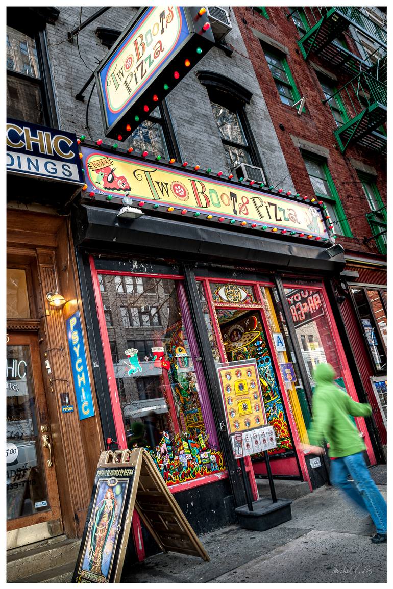 An unexpected combination: a pizza restaurant and a psychic readings parlor located side by side! Was this the reason for the artwork on the restaurant’s window to be painted in a psychedelic style? (9th Avenue, Manhattan, New York City, March 2012) • Urban street photography LIMITED SINGLE EDITIO...