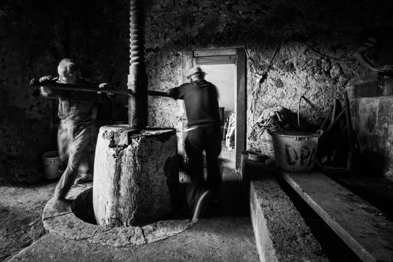 Grape harvest at the foot of Etna made in the traditional way with wooden millstone. Part of a project that aims to tell farming traditions of Italy, preserved only by the elderly.The title is in Sicilian dialect, indicate the grape must collected in a cylindrical shape. Limited edition of 10 copie...