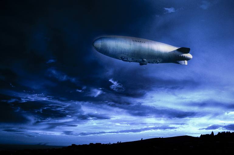 Photograph of a US Navy blimp over Los Angeles at sunset. Limited Edition of 25. Giclee pigment print on Museum Archival matte paper. Signed, dated and numbered on verso. Unframed. Shipped in mailing tube.