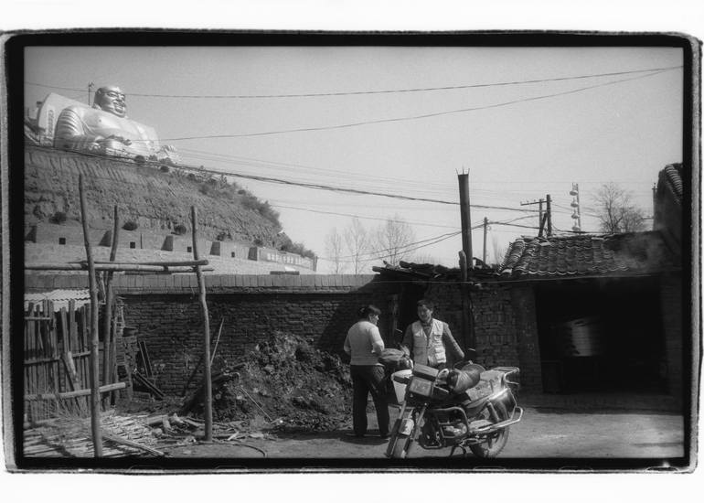 Somewhere in the rural areas of Shanxi Province, China, people work under the golden Buddha statue.