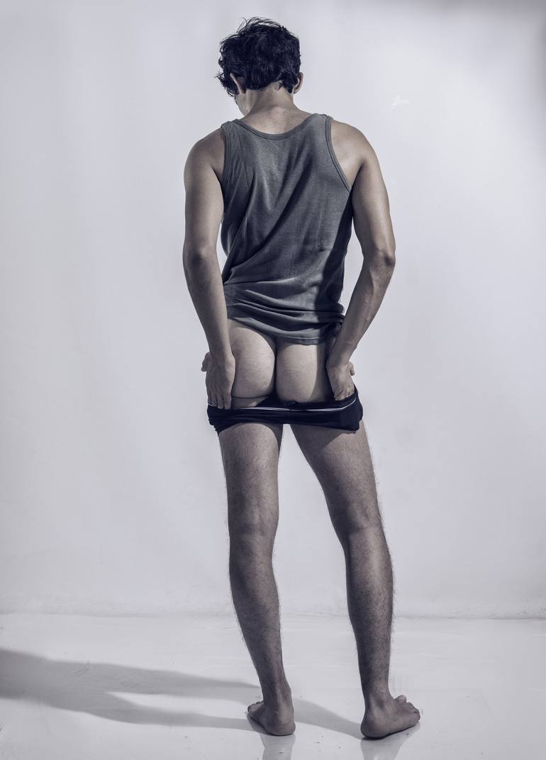 In this male nude photograph, my dear friend Alessandro, a young and athletically built man, stands against a neutral backdrop, his back to the camera, and wearing just a tank top. He's exposing his butt, pulling down his underwear in a a very provoking pose. The composition elegantly highlights his...