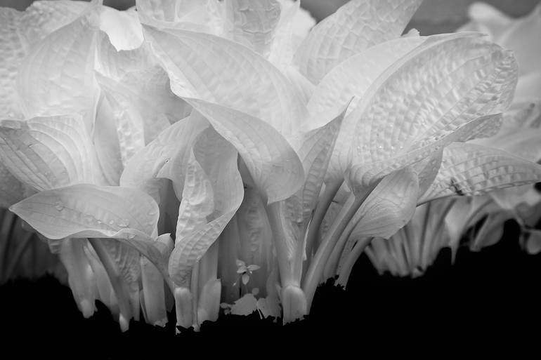 Leaves of the common landscape plant, the hosta, photographed with an infrared enabled digital camera. The young leaves are unfolding and have some raindrops on them. The infrared rendition reveals plants as white, imparting a unique and delicate appearance.The limited edition print is 1 of 5 plus 2...