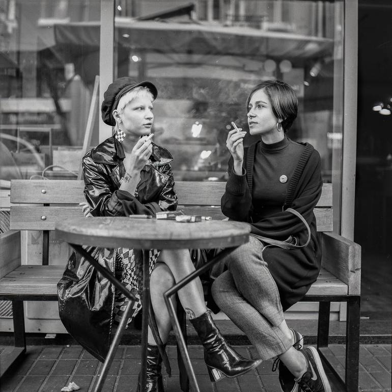 Two eclectic artists sit outside a cafe in Kiev, Ukraine on a summer evening. I loved their retro looks and felt it fit so well with the vintage film camera; it seems this picture could have been taken during any era in the 20th century.