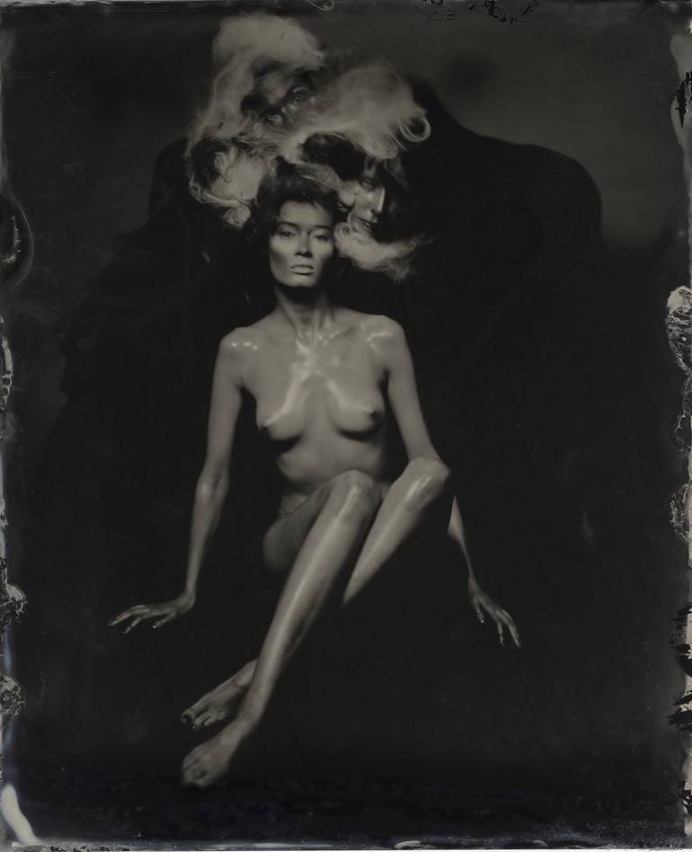 This work is one of a series of mystical, meditative artistic nudes "Valkyries & Elves". This image is made using 19th century authentic wet plate collodion technology with 8x10 inches camera on blackened silver plates. Pure sculptural beauty of women frozen with long exposures arise to antique esth...