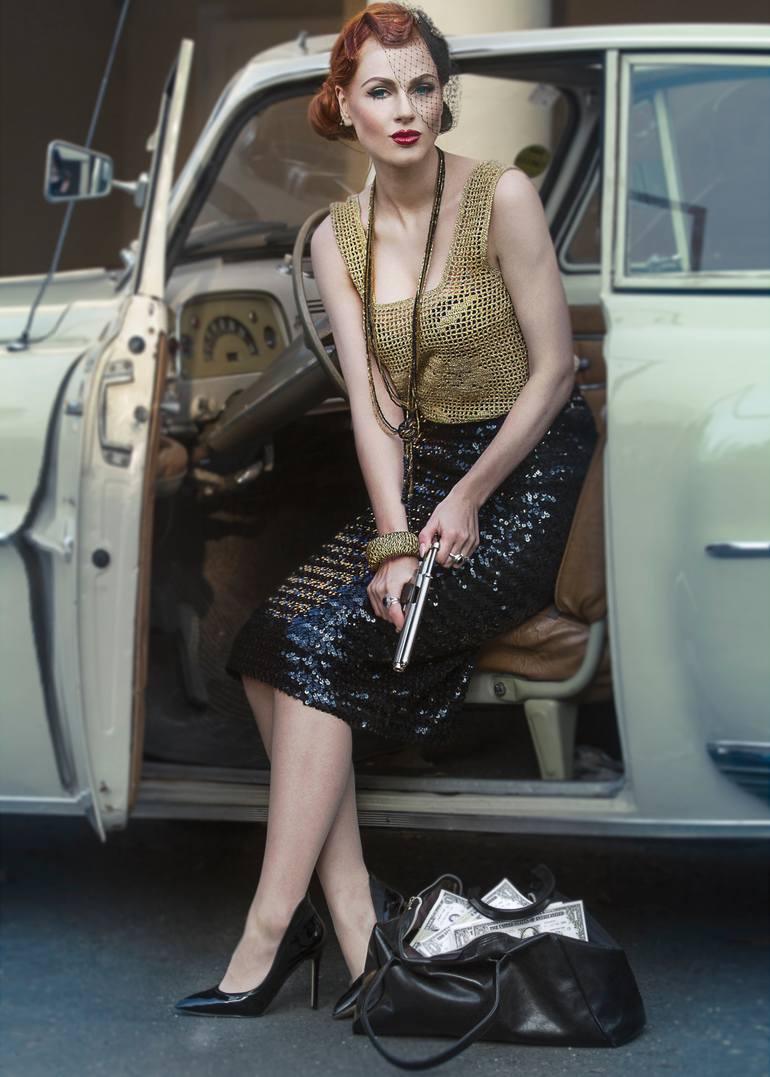 Red hair vintage fashion pin up girl in a film noir triller scene with a gun on old retro car with bag of money...