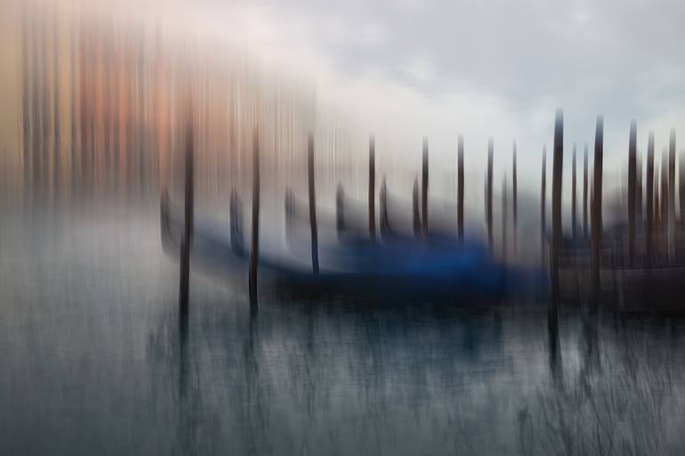 Venetian Gondolas in the Mist This image is part of a series of pictures of Venetian Gondolas. The blurred motion of gondolas tethered to their mooring posts is created in-camera by combining a long exposure and intentional camera movement. The image is a limited edition of 10 giclée fine art pri...
