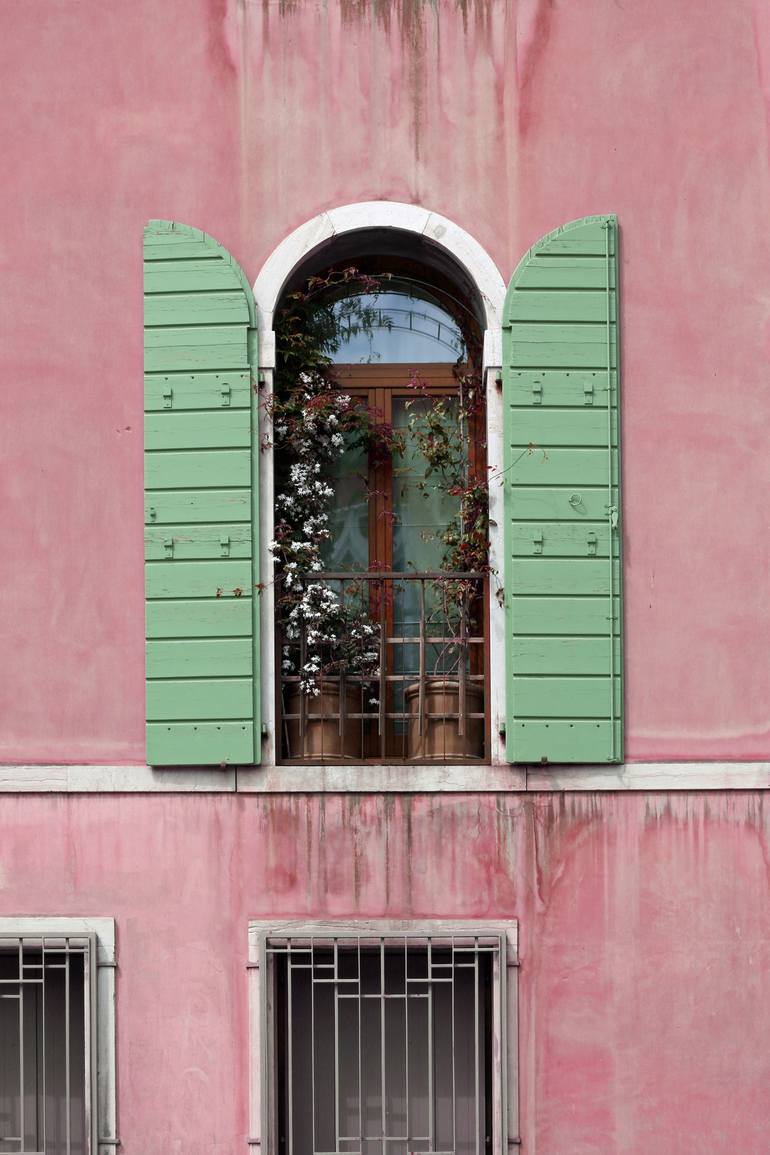 I liked the softness of the patterns in this Venetian building, as well as its arched window, but felt the original drab color needed to be enhanced. I chose rosy pink and mint green to compliment the climbing floral vines. This image was photographed in Venice, Italy on a lovely April day.