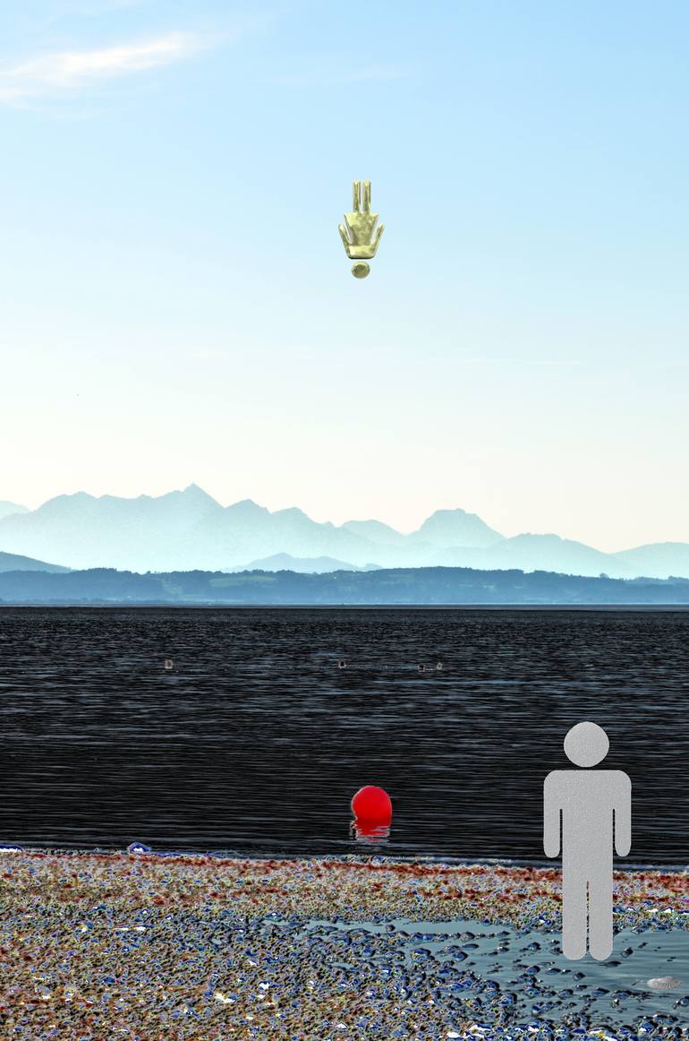 Venus on her way back into the water from which she emerged after having crossed the alps and multiple dimensions. Manipulated photograph of the Chiemsee infront of the Bavarian alps. Epson K3 Fine Art premium print on Hahnemühle Fine Art Pearl (285 g/m²). Monoprint signed on the back, 1 cm white ma...