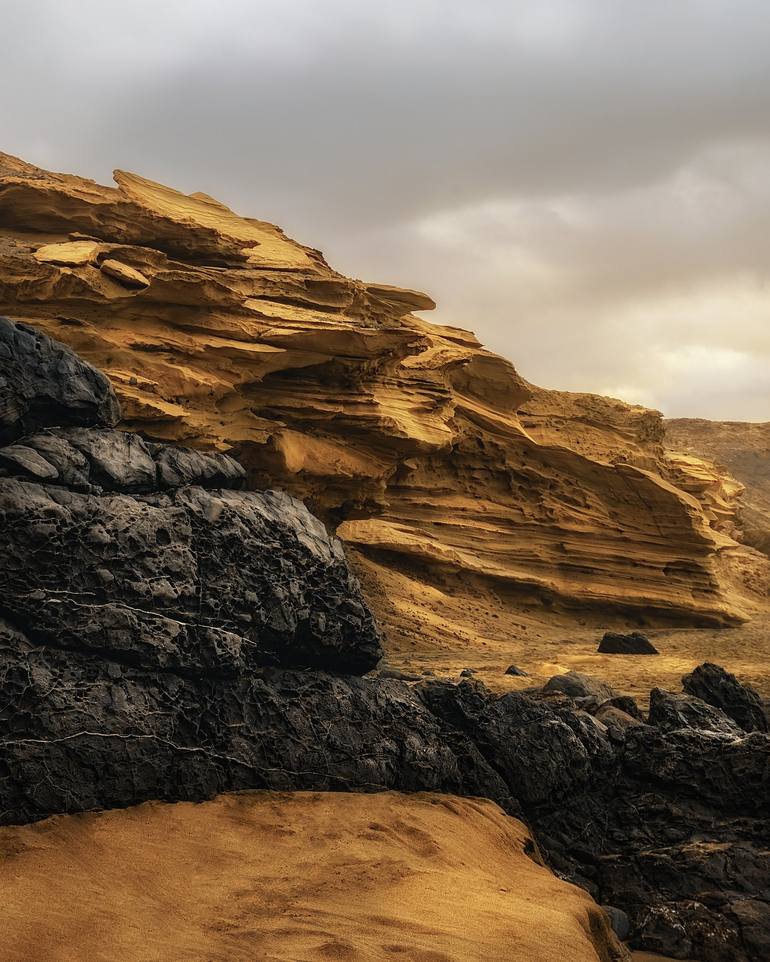 A breathtaking fusion of time and nature’s artistry, this photograph captures a mesmerizing desert landscape where golden sandstone formations meet deep black volcanic rocks. The intricate layers of sediment, sculpted by wind and time, rise dramatically against the moody, overcast sky, creating a po...