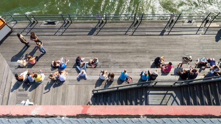 High afternoon summer sun glints off the water of the South Street Seaport tour boat dock in a setting that no longer exists. Looking down from two floors above, we see tourists lounging as they await their assigned boat in a languid composition. NOTE: Actual image size is 8 inches high x 12 inches...
