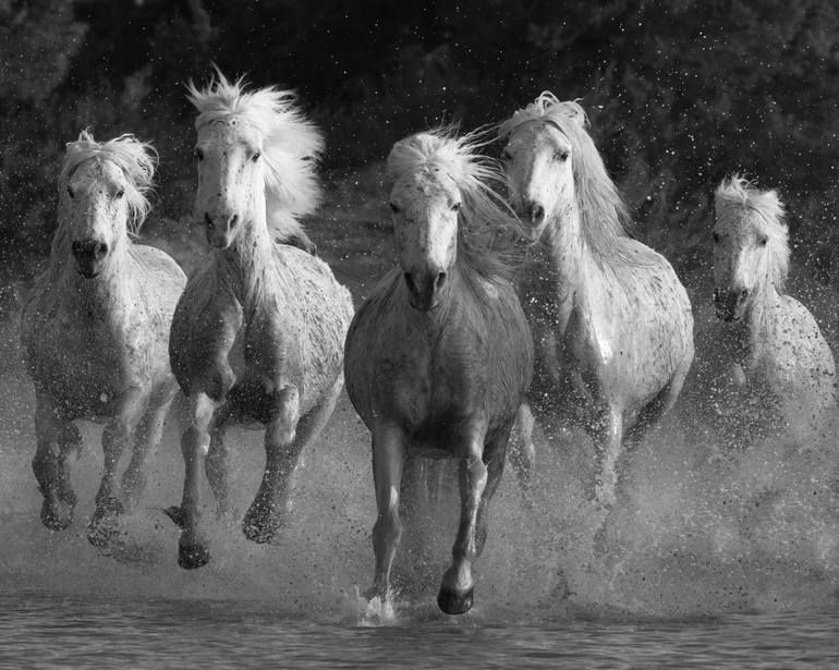 This dramatic and dynamic horse image of white horses running full speed through the water is part of award-winning photographer and author Carol J. Walker's "White Horses of the Camargue" collection featuring the famous white horses of the Camargue, a region in southern France. This stunning breed ...