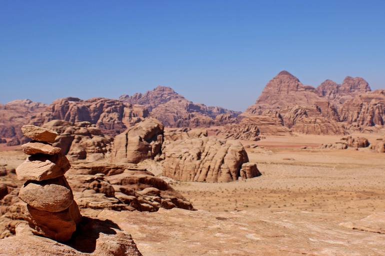 During the climb to Burdah Bridge in Wadi Rum Jordan you find local markers left by the Bedouins to help find the way. This method is used along many routes as can be easy to lose your way and be the wrong side of a big rock with nothing but vertical drops..