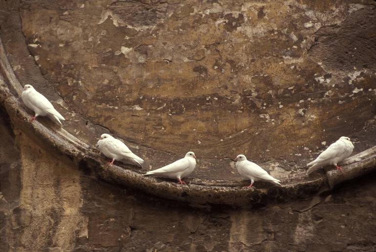 White doves relaxing on a wall in Valencia, Spain