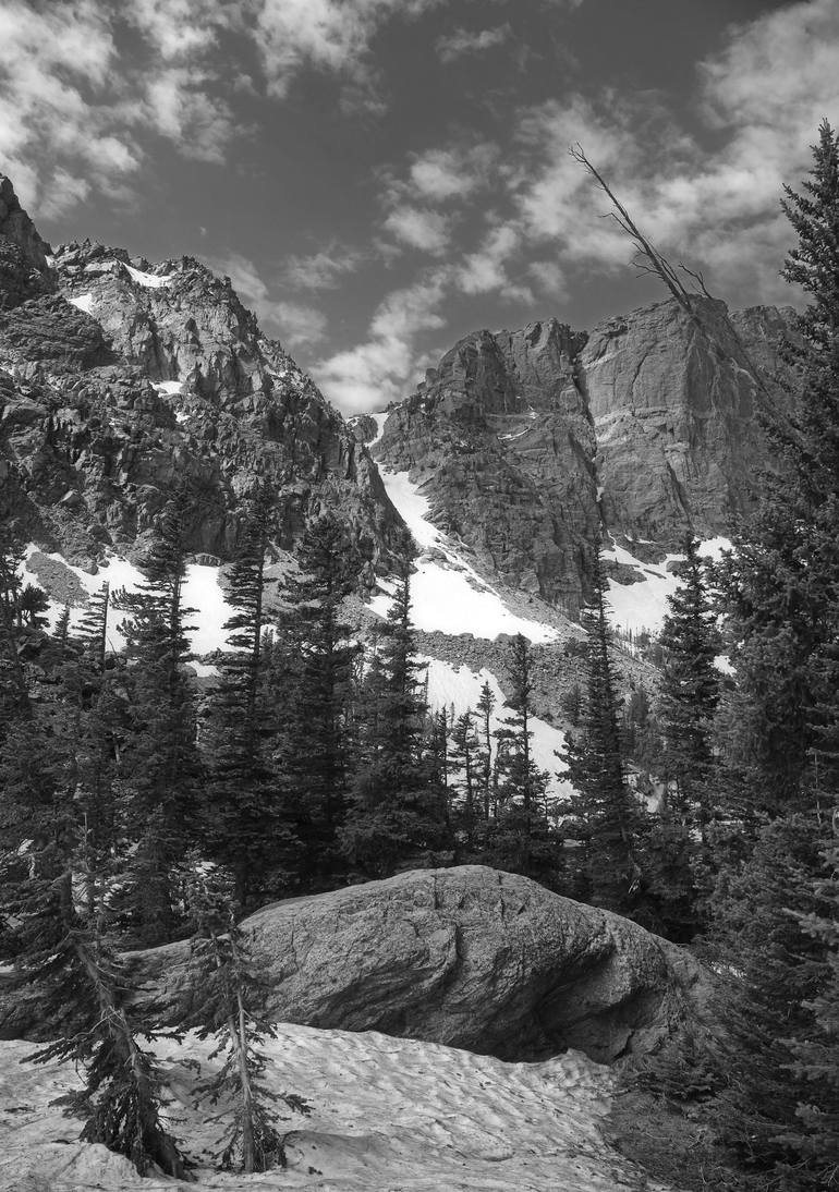 This beautiful scene in Rocky Mountain National Park features snow covered peaks in early spring. The image came to life as morning light crept in lighting the foreground below. A long hike through challenging conditions was made to reach this point near Emerald Lake.