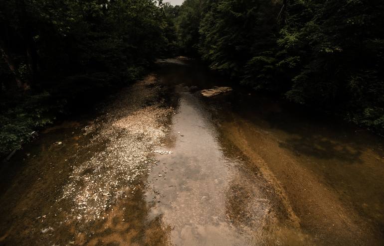 Sunlight cuts across Philadelphia's Wissahickon Creek. Note: this work is printed on aluminum, and has a wall mount attached. It does not need to be framed.