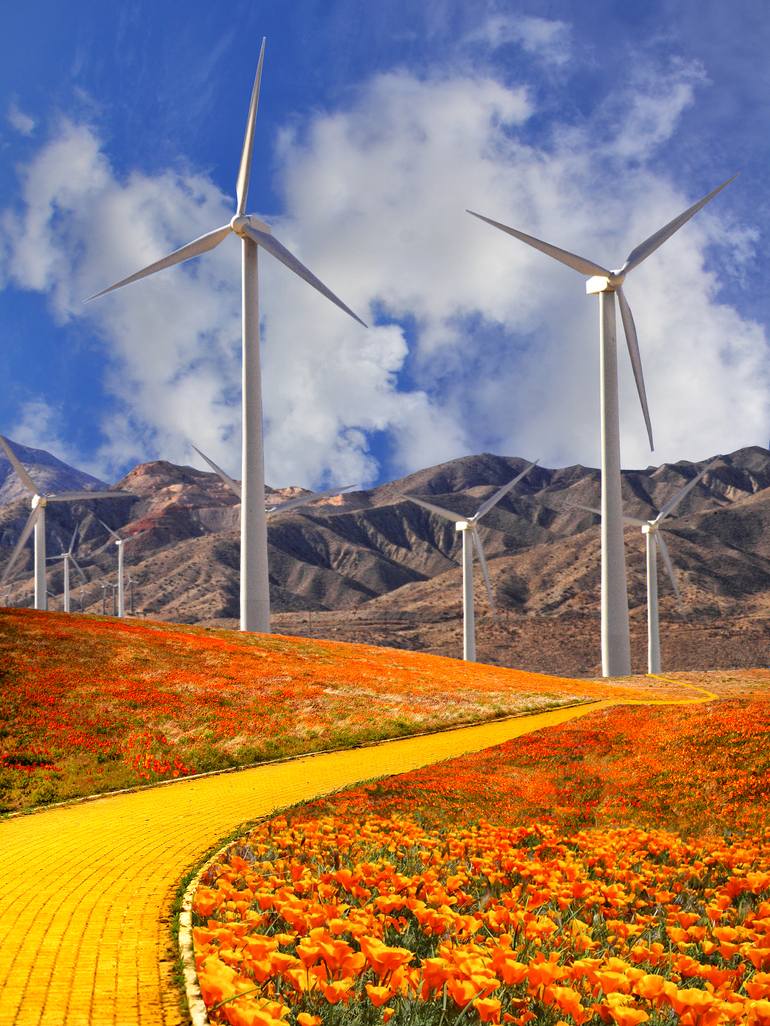 The Yellow Brick Road winding through the poppy fields and iconic windmills in the Coachella Valley, created by photographer William Dey. OZ Palm Springs Art Exhibition Archangel Collective Art Gallery Palm Springs, California. Image is printed on matte crisp white museum-quality Picture Rag paper a...
