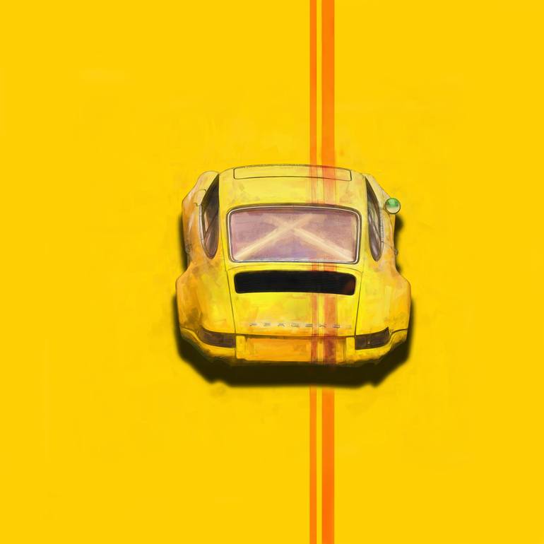 An overhead photograph of a historic racing Porsche 911. Original image has had background removed and a solid yellow background installed with the red stripes continuing from the car to the edge of the illustration.