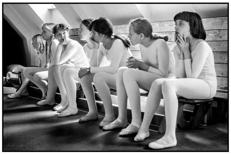 Waiting for their dance lesson, a group of girls sit on a wooden bench as the glowing illumination from skylights lends the scene a feeling of intimacy. (July 2020. Photograph captured on 35mm Tri-X film, Brussels, 1975.) • Black and white fine art photography LIMITED SINGLE EDITIONS (1 of 1 each...