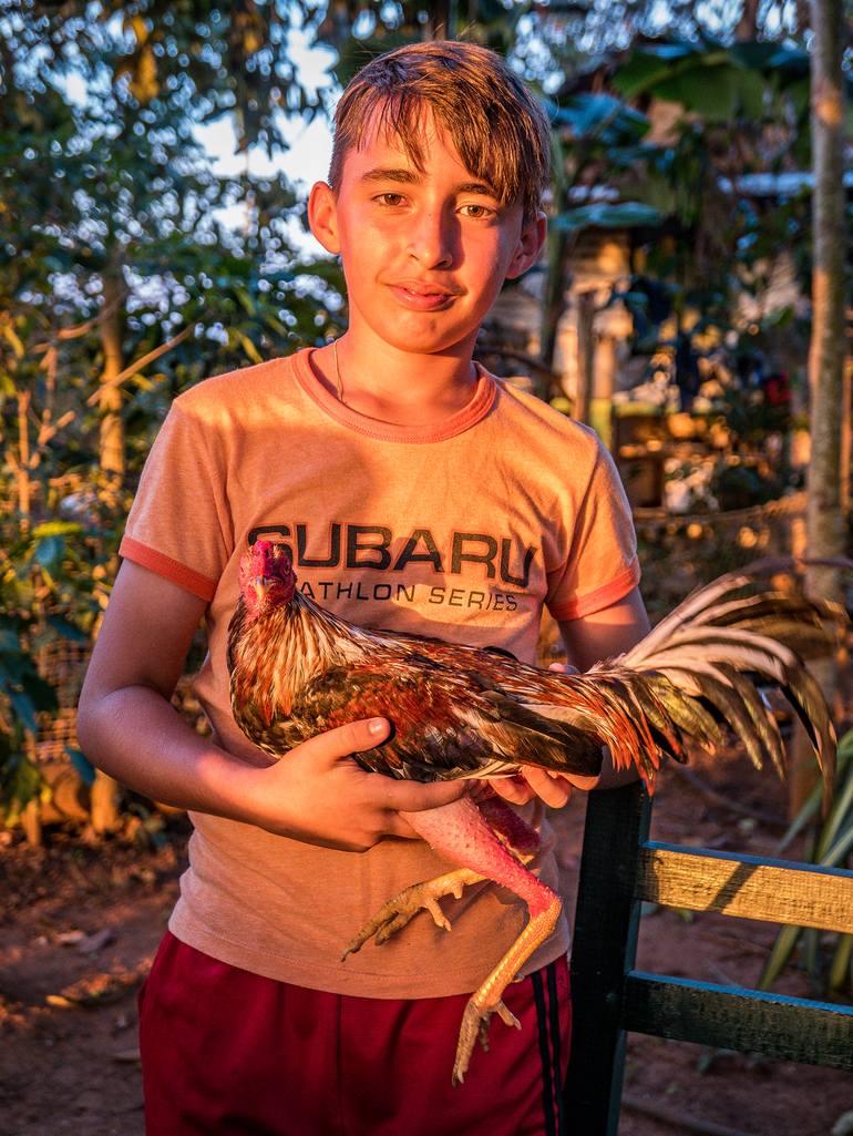 This young boy proudly displays his pet gamecock. Every day after school he takes the fowl from its cage and walks it around the farm. Cockfighting is illegal in Cuba but the practice is still widespread in the rural areas of the country. He rubs alcohol on the belly of the gamecock daily to help ...