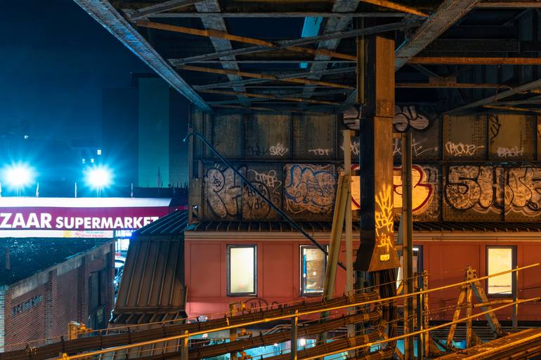 The pungent color casts of this New York elevated subway junction recall the following title of jazz maestro Charles Mingus: "Orange Was the Color of Her Dress, Then Blue Silk" (1964). Edition of 6 + 1 A/P and 1 P/P. Printed exclusively for the artist by Brooklyn Editions' Master Printmaker, New Yo...