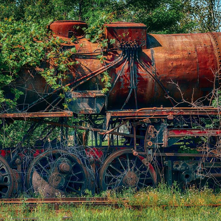 This evocative color photograph, "abandoned train," captures a moment frozen in time. The image, printed on Hahnemühle Fine Art Baryta paper, showcases rich colors and exquisite detail, bringing the stillness of the scene to life. This fine art photography print is part of a limited edition of only...