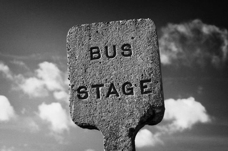 concrete northern ireland road transport board (1935-1948) bus stage stop road sign against blue sky county down northern ireland uk