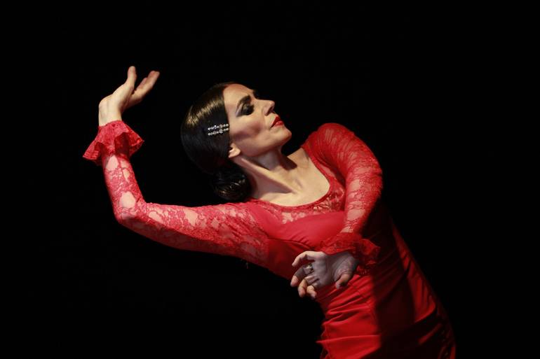 Flamenco dancer dancing traditional flamenco dance on wooden floor and dark background