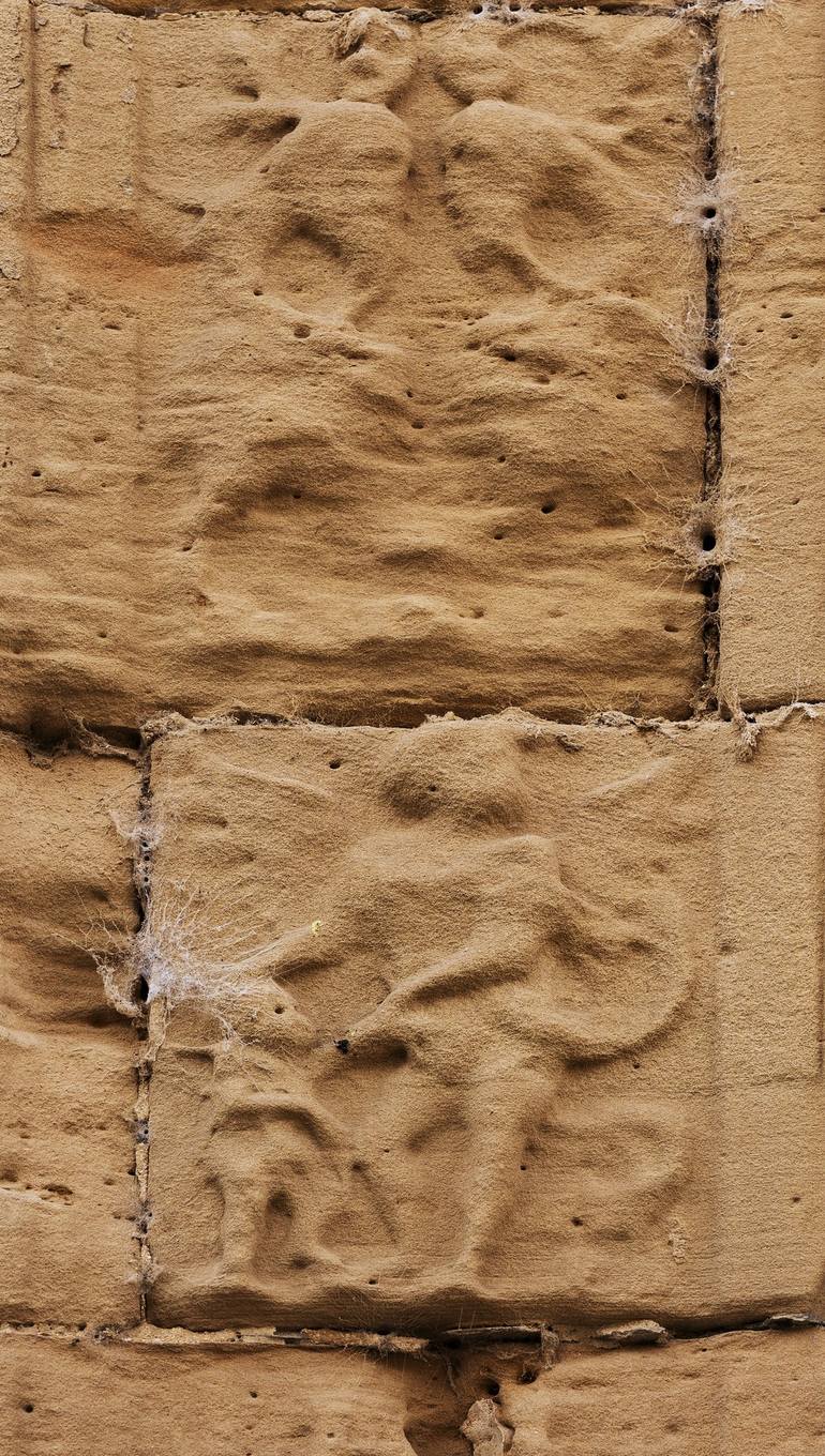 Shot in color detail on the facade of this historic building representing some character, animal or flower.