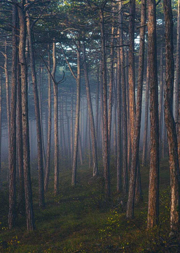 In my digital photograph, I capture the ethereal dance of light and shadow in a mist-enveloped forest, evoking a serene, dream-like tranquility. The interplay between the strong vertical lines of the trees and the soft, embracing fog stirs a sense of mystery and wonder. This piece is steeped in the ...