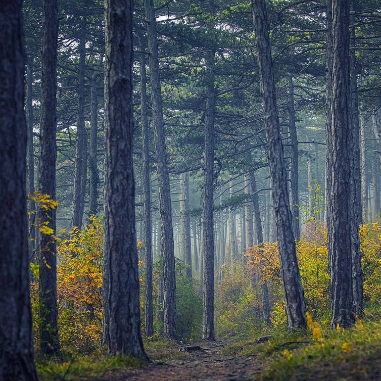 "forest path" is a signed and numbered limited edition print of 20, accompanied by a certificate of authenticity. This fine art photograph, captured in vivid color, invites you to step into a serene landscape. The interplay of light and shadow dances across a path winding through a lush forest, par...