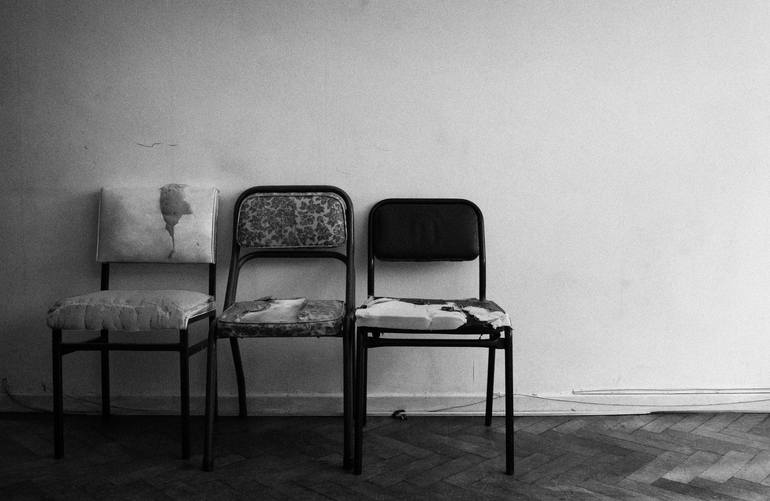 three old dirty worn out chairs against a white wall in a run down apartment in argentina