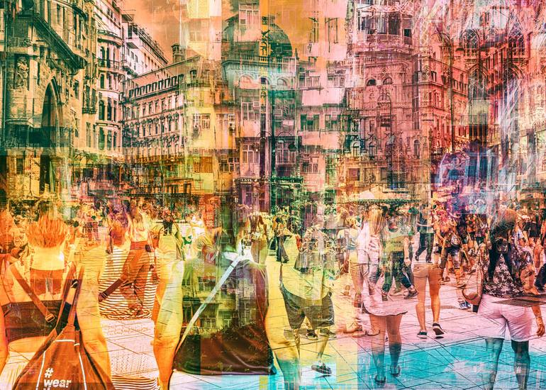 Experience the vibrant energy of "urban flow #12," a captivating abstract photograph printed on Hahnemühle Fine Art Baryta paper. This stunning piece captures the essence of city life, the movement of people, and the dynamic flow of urban environments. The artist masterfully uses color and digital t...