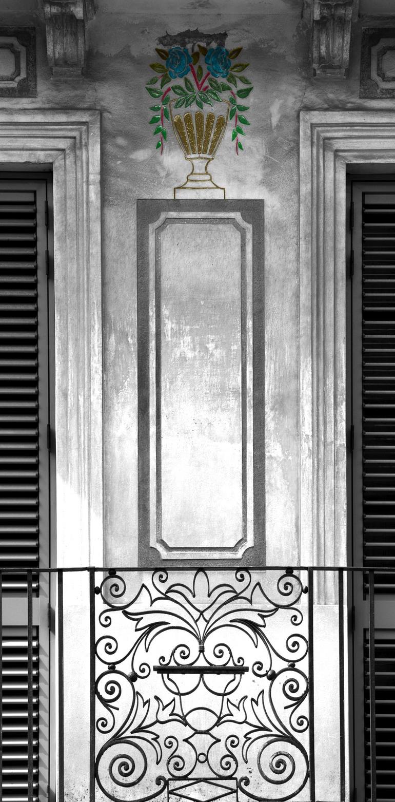 Shot in black and white and painted with colors, a view on some urban details representing some character, animal, flower or another elements digitally transformed to create a new interpretation.