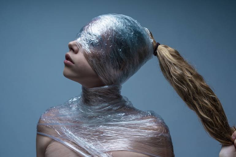 Female wrapped in plastic, the project has a political background and relates to our overuse of plastic in our everyday life