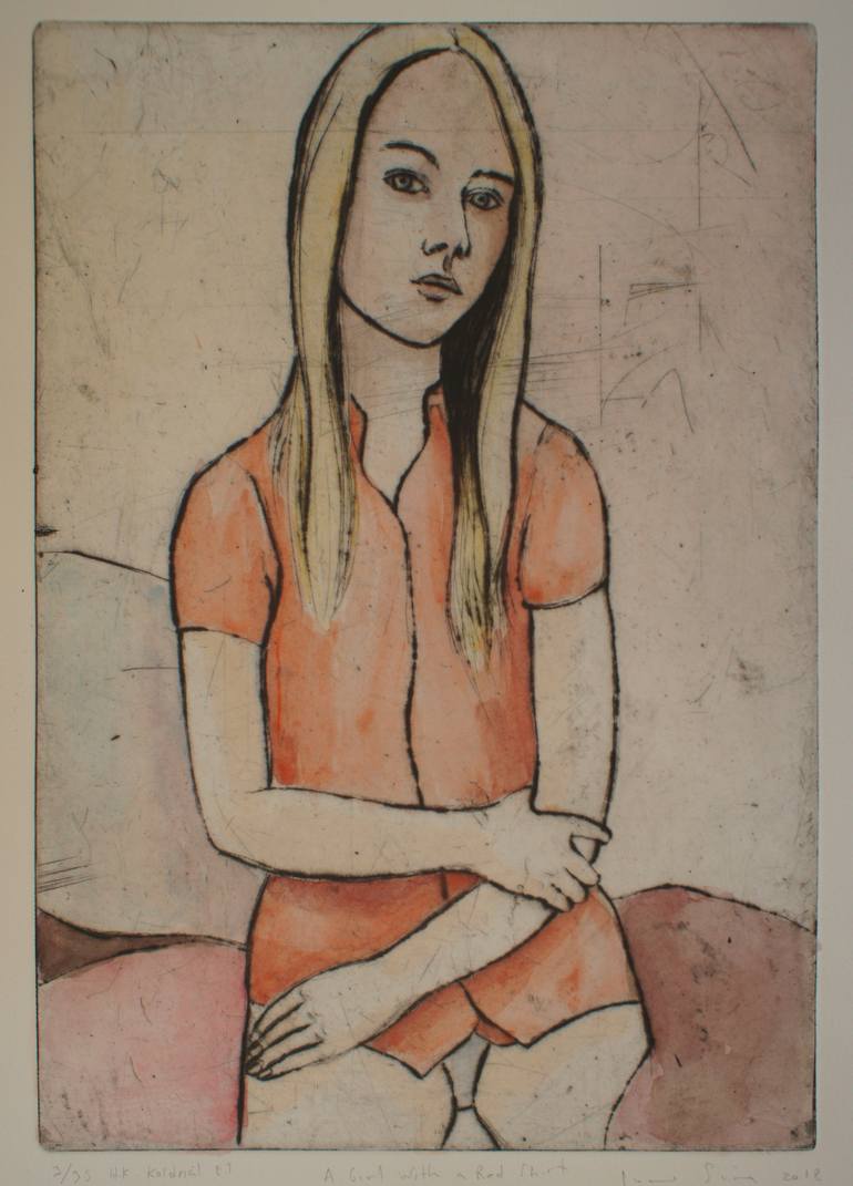 A young girl sitting a nest of pillows. Drypoint printed by me and each print is hand coloured so no one is exactly the same. The print in the photo is the one you get.I will update a new photo after a sale.The size of the image is 25 x 35 cm the paper is 53 x 38 cm.
