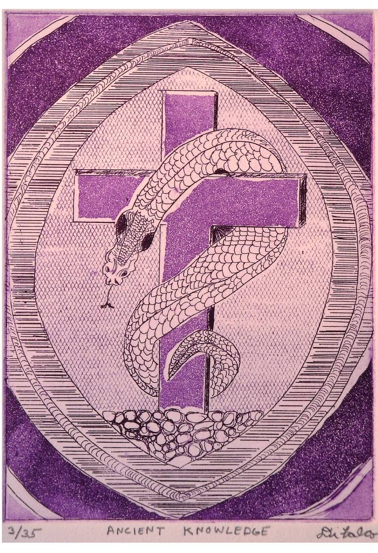 This etching represents the serpent as a primordial Gnostic symbol of salvation and Light. The work, inspired by the German novel by Meyrink, THE GREEN FACE (1917), is executed in a mix of oil-based inks (Charbonnel Brand from France) to produce my own formula for a violet color; the work is hand-pr...