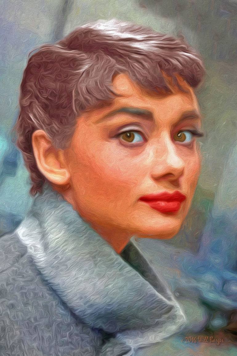 Featuring a rich sense of texture and brushstrokes, this digital painting is based upon a 1950s black-and-white promotional photograph of Audrey Hepburn -- one of the most popular and classically beautiful stars from the Golden Age of Hollywood movies. Look elsewhere on this site for renderings of t...