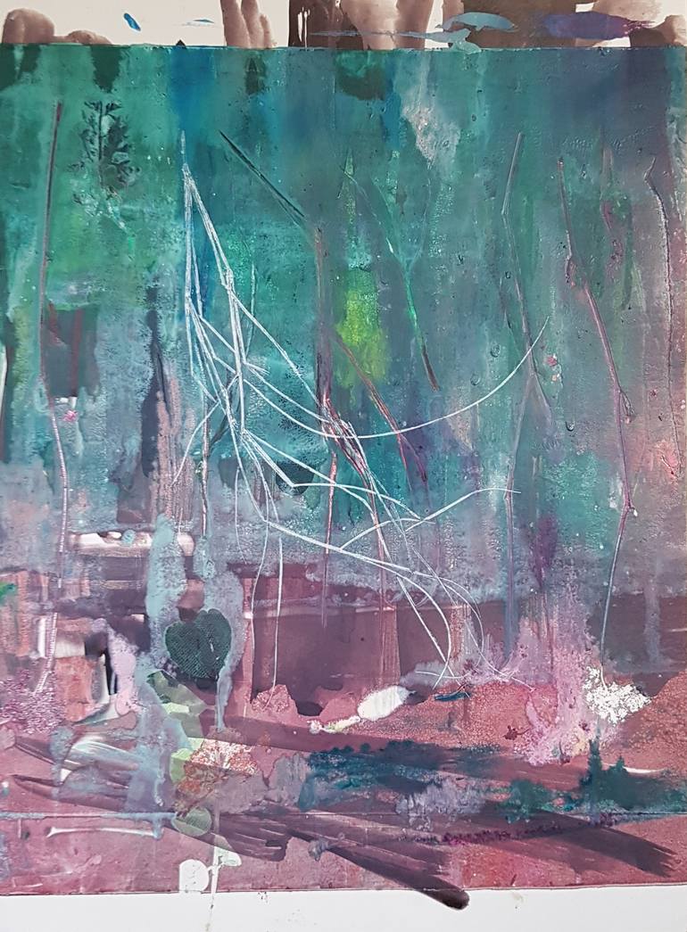 This monotype is printed several layers with heavy printmaking inks. The first layer ink with brush. Real Leaf prints and flower prints are monotyped as different layers.