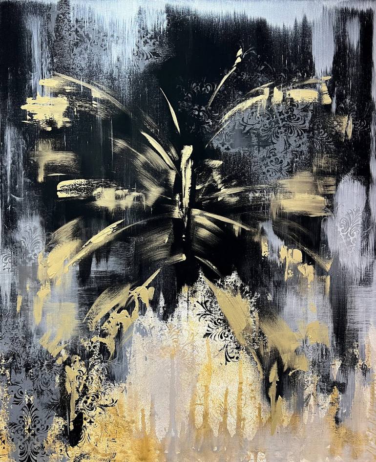 Gold Black interior painting. GOLD TALISMAN Painting for a private collection. The picture is a talisman for happiness in the house. Marina is sure that butterflies bring good luck on their golden wings. Silver and lace add sophistication and style to the interior. Very original painting in the a...