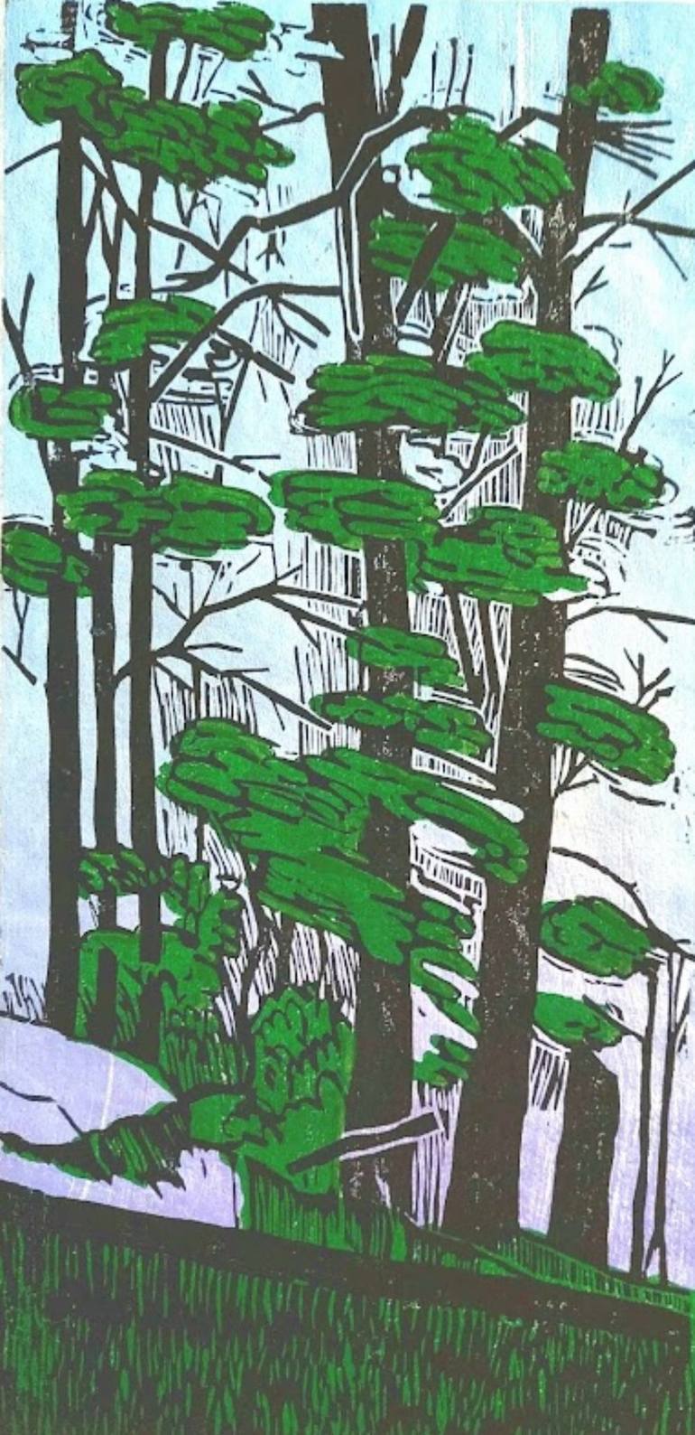 BLACKWATER WOODS original hand printed color woodcut printed in 3 colors. Image depicts a scene along one of the many hiking trails in West Virginia's Blackwater Falls State Park. Green, Light Blue and Black Ink on mulberry paper. Block size is approximately 7 by 14 inches, print is signed by the ar...