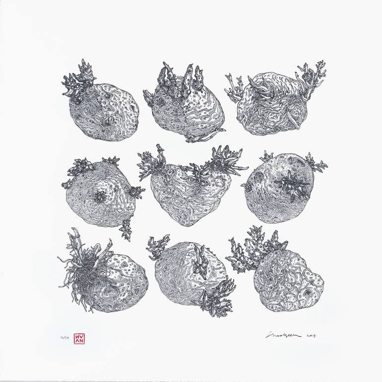 Printmaking: Screenprinting on Paper. "Don't forget your roots. Potatoes" Limited serigraph on 100% cotton paper 200 gsm with hand-deckled edges. 21,6х21,6 inches (55x55 centimeters) Edition of 59, signed and numbered by the artist. This print does not come in a frame and is shipped rolled up in...