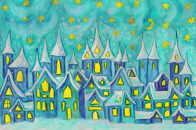 Fairy tales town in blue and blue colours, painting. This painting is for sale only as prints and digital licenses because it is digital variant of original painting with colours changed in photoshop. Original painting for sale is here: This is Artistic produced limited edition prints of 26. Origi...