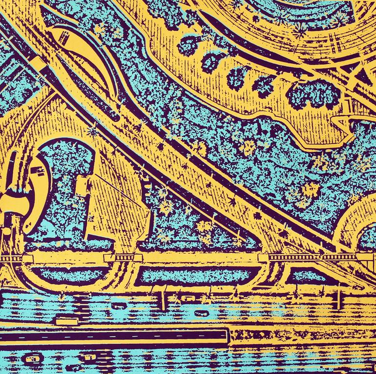 Seen from above the highways become the linear and circular design elements of the painting. The highways and interchanges are the focus of the composition which take you through the painting. Reduced to linear motion, details are contrasted by the use yellow, turquoise and purple. The image is 9” x...