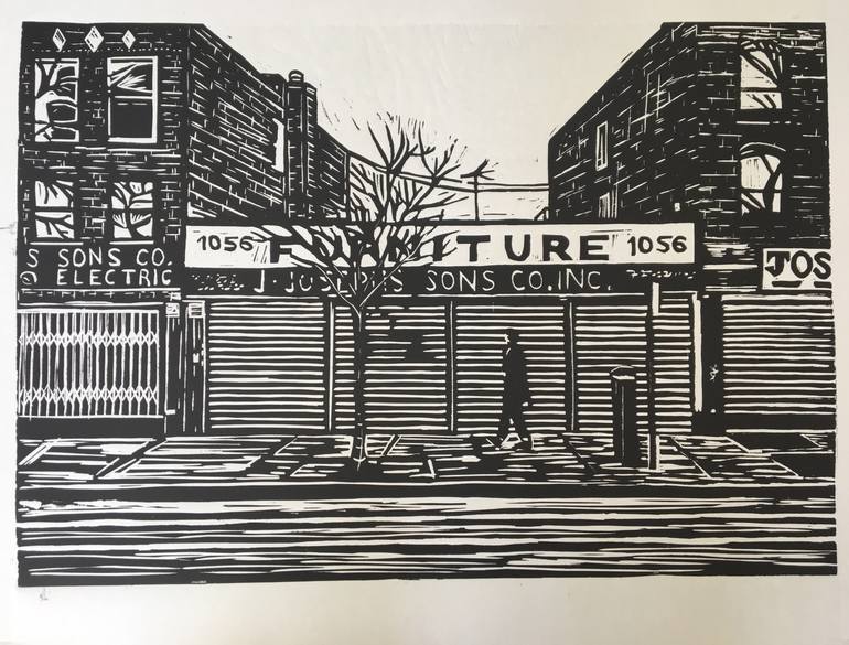 This print was inspired by a photograph a friend took of his local store in Greenpoint as it closed down. I was stuck by the elegant single figure which passed through the scene, juxtaposed against the lines of the shutters and the bare branched tree which seemed to evoke a sense of time passing us ...