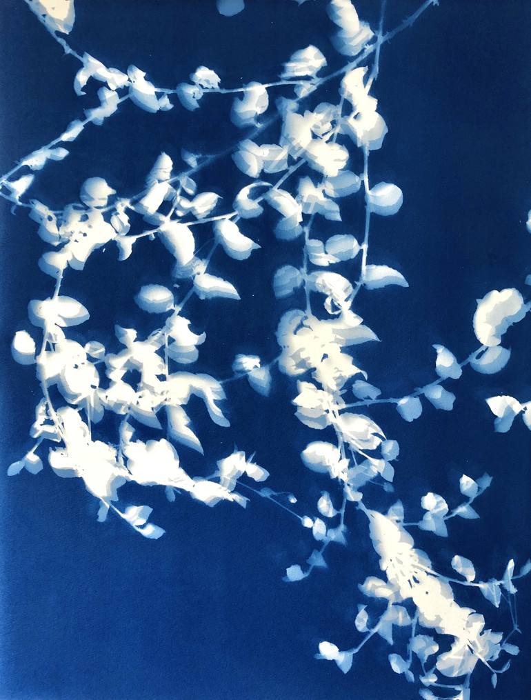 My botanical cyanotypes are each one-of-a-kind slow cameraless photographs made outdoors using natural light. There is no lens and there is no etched plate or printing press. As much time is spent in their composition as goes into the exposure and rinsing. This is a triple-exposure cyanotype, which...